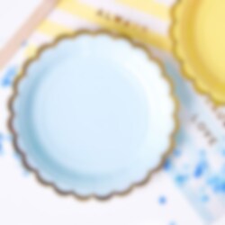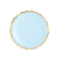 6 papieren bordjes met lichtblauwe achtergrond en goudfolie randen. Leuk om neer te zetten voor het kinderfeestje of babyshower. De bordjes zijn ongeveer 18 cm in doorsnee.