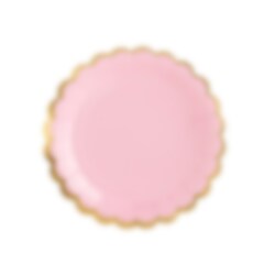 6 pastelroze papieren bordjes met goudfolie aan de randen. Stijlvol om neer te zetten voor het kinderfeestje of de babyshower. De bordjes zijn ongeveer 18 cm in doorsnee.