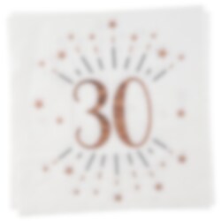 10 witte servetten met roségoud glitterpatronen en het getal '30'. Deze servetten zijn erg decoratief als je een tafel dekt voor een 30-jarig feest. De servetten hebben drie lagen en voelen luxe aan. Uitgevouwen hebben ze een afmeting van 16,5 x 16,5 cm.