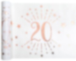 Mooie tafelloper die schittert met decoratieve patronen in roségoud en het getal '20'. Deze tafelloper komt in een handige rol en is 30 cm breed en maar liefst 5 meter lang. Het is genoeg voor meerdere tafels en een groot 20-jarig feest. Het materiaal is 100% polyester.