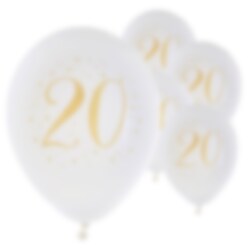 8 witte ballonnen met een 20-jarige opdruk en gouden sterren. De ballonnen zijn decoratief en passen goed bij veel andere decoraties en tafelaccessoires voor je 20ste verjaardag.