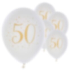 8 witte ballonnen met een 50-jarige opdruk en gouden sterren. De ballonnen zijn decoratief en passen goed bij veel andere decoraties en tafelaccessoires voor je 50ste verjaardag.