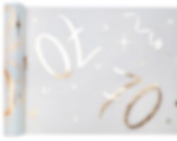 Witte tafelloper met decoratieve patronen en het getal '70' in goudfolie. Deze tafelloper komt in een handige rol en is 30 cm breed en maar liefst 5 meter lang. Het is genoeg voor meerdere tafels en een groot feest. Het materiaal is 100% polyester.