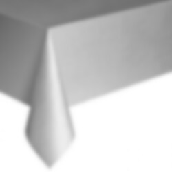 Plastic tafelkleed in zilverkleur dat 137 x 274 cm groot is.