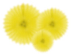 3 prachtige papieren waaiers in een vrolijke gele kleur. De waaiers zijn eenvoudig uit te vouwen en op te hangen aan de muur of boven de tafel om een feestelijke sfeer te creëren. Perfect voor verjaardagen, doopfeesten, babyshowers en andere feestelijke gelegenheden.