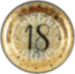 10 glinsterende borden in goud met het getal '18' in zwart. Deze borden zijn mooi en perfect om te gebruiken voor het 18-jarig feest. De borden zijn gemaakt van papier en hebben een diameter van 22,5 cm.