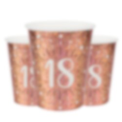 10 glinsterende papieren bekers in roségoud met het getal '18'. Deze bekers zijn echt mooi en decoratief als je ze neerzet voor een 18-jarig feest. De bekers zijn ongeveer 10 cm hoog en hebben een inhoud van ongeveer 270 ml.
