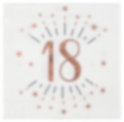 10 witte servetten met roségoud glitterpatronen en het getal '18'. Deze servetten zijn erg decoratief als je een tafel dekt voor een 18-jarig feest. De servetten hebben drie lagen en voelen luxe aan. Uitgevouwen hebben ze een afmeting van 16,5 x 16,5 cm.