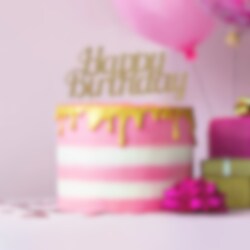 Taartdecoratie met de tekst "Happy Birthday" in een sprankelende gouden kleur. Versier de taart hiermee als er een verjaardagsfeestje is om de taart extra chique te maken. De decoratie is ongeveer 10 x 14 cm groot.