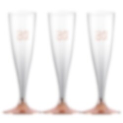 6 stuks mooie en praktische wegwerpglazen in champagnestijl. De plastic glazen zijn leuk om zowel de tafel mee te dekken als om mee te mengen met je gasten op het 30e verjaardagsfeest. De glazen hebben een inhoud van 14 cl en staan op een voet van roségoud met het getal 30' bovenaan gedrukt.