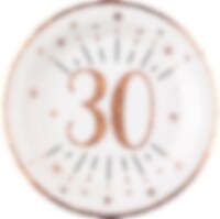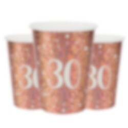 10 glinsterende papieren bekers in roségoud met het getal '30'. Deze bekers zijn echt mooi en decoratief als je ze neerzet voor een 30-jarig feest. De bekers zijn ongeveer 10 cm hoog en hebben een inhoud van ongeveer 270 ml.
