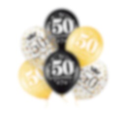 Vier de 50e verjaardag in stijl! Deze set bevat twee zwarte, twee goudkleurige en twee transparante ballonnen met confetti, allemaal bedrukt met een prachtige “50” die de versiering compleet maakt.