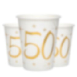 10 witte papieren bekers met decoratieve sterren en het getal 50 in goudfolie. Deze bekers zijn prachtig en een perfecte toevoeging aan de tafelschikking voor het 50-jarig feest. De bekers zijn 10 cm hoog en hebben een inhoud van 270 ml.