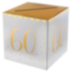 Deze cadeaudoos in wit en goud is perfect voor je 60ste verjaardag. Ongeacht of je geld wilt inzamelen, felicitaties of groeten. De doos heeft een diagonale snede in het gouden slot en het getal 60 aan elke kant. Het is kubusvormig en 20 x 20 cm groot.