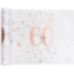 Mooie tafelloper die schittert met decoratieve patronen in roségoud en het getal '60'. Deze tafelloper komt in een handige rol en is 30 cm breed en maar liefst 5 meter lang. Het is genoeg voor meerdere tafels en een groot 60-jarig feest. Het materiaal is 100% polyester.