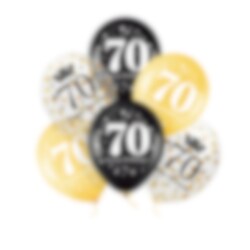 Vier de 70e verjaardag in stijl! Deze set bevat twee zwarte, twee goudkleurige en twee transparante ballonnen met confetti, allemaal bedrukt met een prachtige “70” die de versiering compleet maakt.