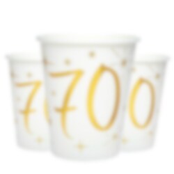 10 witte papieren bekers met decoratieve sterren en het getal 70 in goudfolie. Deze bekers zijn prachtig en een perfecte toevoeging aan de tafelschikking voor het 70-jarig feest. De bekers zijn 10 cm hoog en hebben een inhoud van 270 ml.