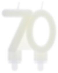 Taartkaars die elegant schijnt in het donker in de vorm van het getal '70'. De taartkaars heeft een afmeting van 7,5 x 9 cm.