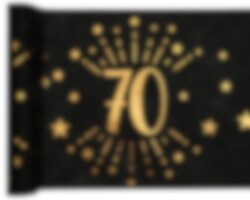 Zwarte tafelloper met decoratieve patronen en het getal '70' in goudfolie. Deze tafelloper komt in een handige rol en is 30 cm breed en maar liefst 5 meter lang. Het is genoeg voor meerdere tafels en een groot feest. Het materiaal is 100% polyester.