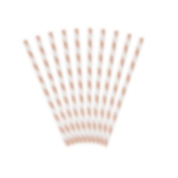 10 st. mooie kartonnen rietjes in wit met strepen in metallic roségoud. De rietjes zijn ongeveer 19,5 cm lang.