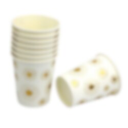 10 elegante witte papieren bekers met een patroon van madeliefjes in goud. De papieren bekers zijn 10 cm hoog en hebben een inhoud van 250 ml.