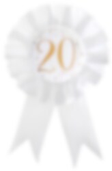 Mooie rozet in wit en goud met het getal 20 erop gedrukt. De rozet kan zowel als decoratief accessoire in bijvoorbeeld bloemstukken worden gebruikt, als door jou gedragen worden op je 20ste verjaardag. De rozet zijn 8 cm in diameter en 15 cm hoog.