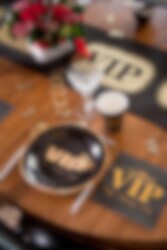 10 zwarte papieren borden met gouden rand en de tekst VIP in het midden. Deze bordjes zijn perfect als je een themafeest, een filmvertoning wilt organiseren, of iets lekkers wilt serveren aan bijzonder belangrijke gasten.
