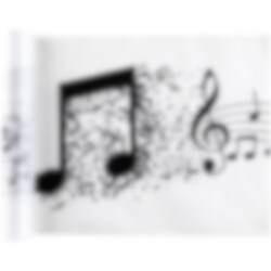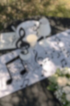 Witte tafelloper met decoratieve patronen van zwarte muzieknoten. De tafelloper is perfect als je een themafeest wilt organiseren waarbij muziek centraal staat.