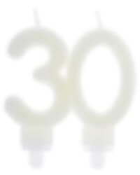 Taartkaars die elegant schijnt in het donker in de vorm van het getal '30'. De taartkaars heeft een afmeting van 7,5 x 9 cm.