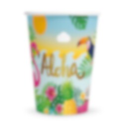 Serveer koude dranken in deze kleurrijke bekers met Aloha-afbeeldingen. Het zomerse ontwerp met flamingo's, toekans, ananassen, watermeloenen, bloemen en palmbomen creëert een heerlijk vakantiegevoel en is perfect voor een zomerfeest, een Hawaï-kinderfeestje, een poolparty of een tropisch themafeest.