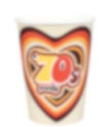 10 stoere papieren bekers in jaren 70-thema. Ze zijn leuk om te hebben voor een disco of themafeest. De bekers zijn ongeveer 10 cm hoog en hebben een inhoud van ongeveer 270 ml.