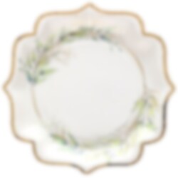 10 prachtig gevormde papieren bordjes van hoge kwaliteit met bladmotieven, en zowel goudgefolieerde details in reliëf als gouden randen. De bordjes passen zowel bij kinderfeestjes, doopfeesten, andere feesten en bruiloften, en kunnen goed gecombineerd worden met andere tafelaccessoires uit dezelfde collectie en andere decoraties in groene kleuren en goud.