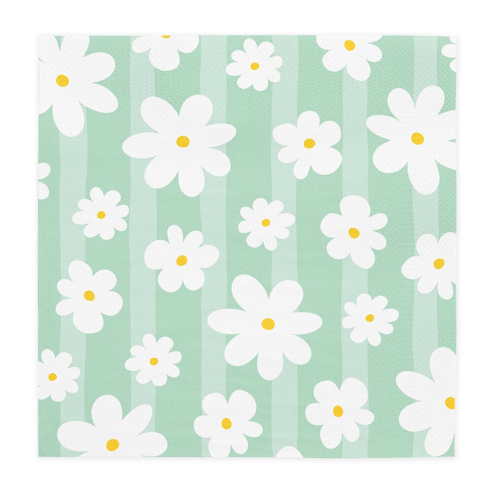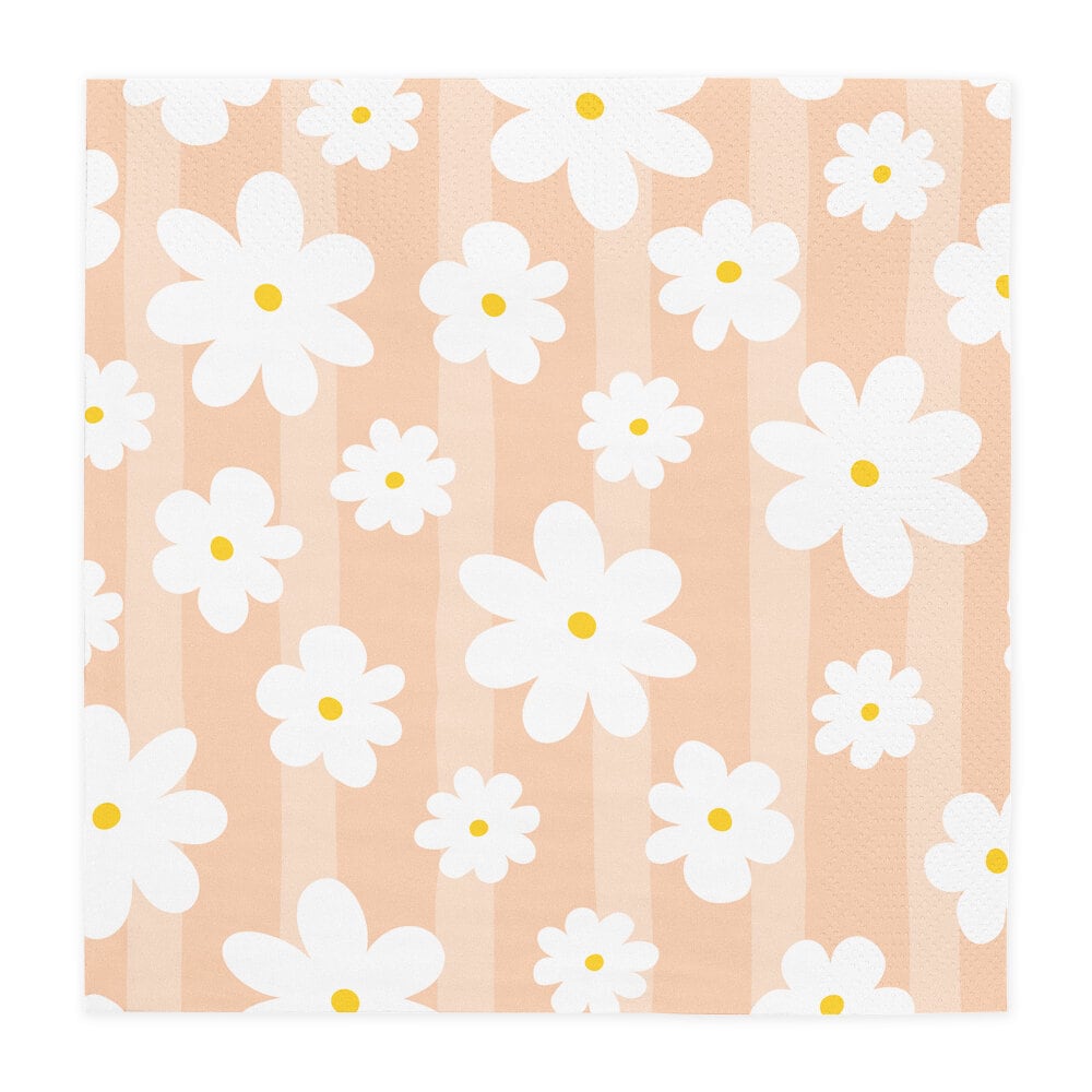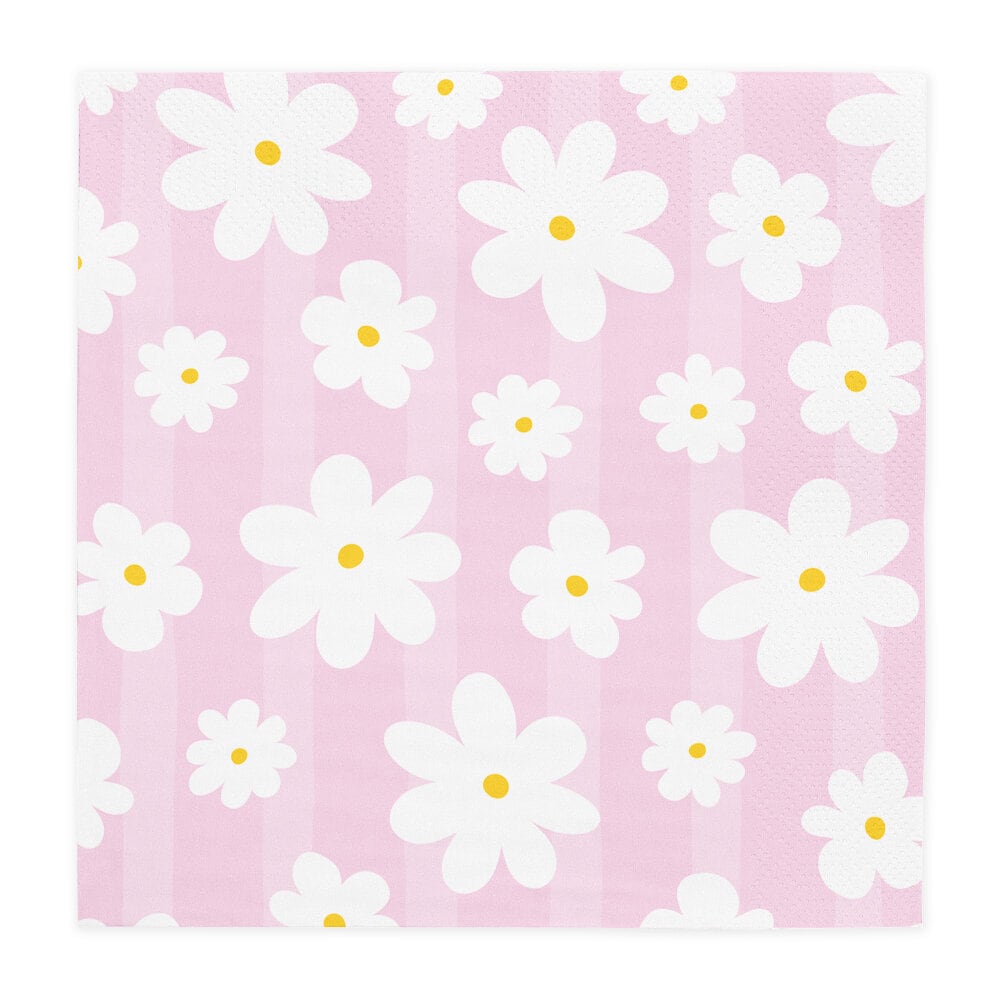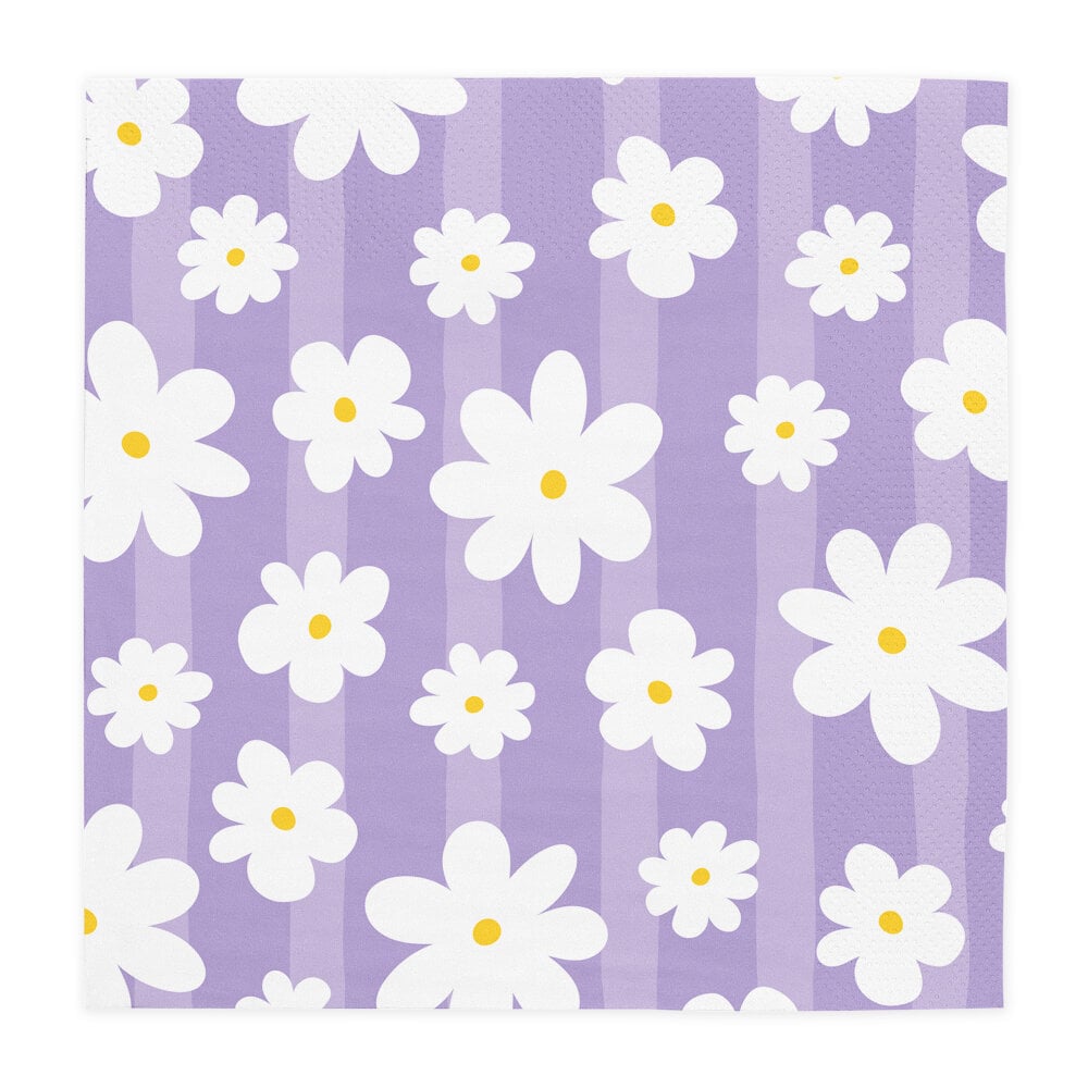 Dek de tafel voor een zomers en charmant feestje met deze mooie servetten in zachte pastelkleuren. De servetten zijn lila, mintgroen, roze en abrikoos en zijn versierd met witte madeliefjes, waardoor ze een speels en uitnodigend detail vormen voor een verjaardag, babyshower, picknick of zomerfeest.
