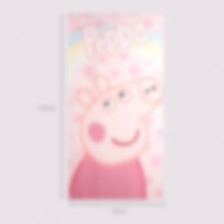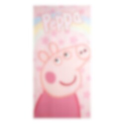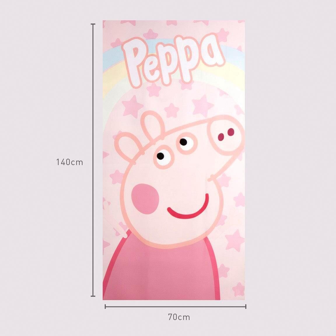 Deze kleurrijke Peppa Pig badhanddoek is versierd met een grote afbeelding van Peppa tegen een roze achtergrond vol sterren en een regenboog. De handdoek is gemaakt van 100 % sneldrogend polyester, waardoor hij ideaal is om mee te nemen naar zowel het strand als het zwembad.