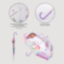 Hij heeft 8 baleinen en opent handmatig. Dankzij het stijlvolle ontwerp met Gabby’s Dollhouse-afbeeldingen wordt deze paraplu vast en zeker een favoriet van alle jonge fans van de serie.