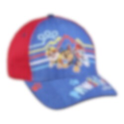 Leuke kinderpet in de kleuren blauw en rood met Marshall, Chase en Rubble erop uit Nickelodeons populaire serie Paw Patrol. De pet is gemaakt van 100% polyester.