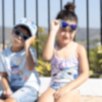 Premium zonnebrillen voor kinderen met stoere details en motieven van Lilo & Stitch. Op de bogen rond de getinte glazen bevindt zich Stitch aan beide zijden.
