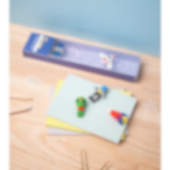 5 gummen die verschillende ruimtevoorwerpen in fijne kleuren vertegenwoordigen. Een leuk detail om in je etui te hebben als je naar school gaat.