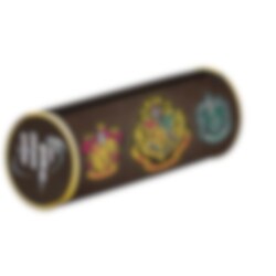 Het etui is elegant donkerbruin met gouden details en toont de wapenschilden van Gryffindor, Hufflepuff, Ravenclaw en Slytherin, met het Hogwarts-embleem in het midden. De ronde vorm maakt het zowel praktisch als stijlvol, klaar voor elke les op de school voor hekserij en tovenarij.