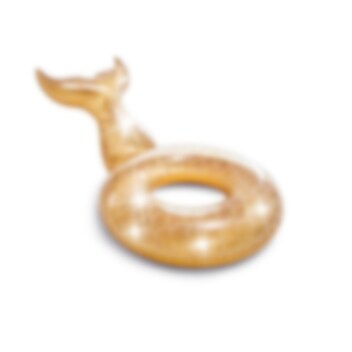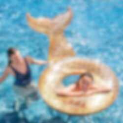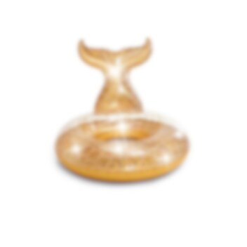 Een echt exclusieve en luxe zwemring met zeemeerminmotief in goud en overvloedige glitter. Je zult de coolste zijn op het strand of bij het zwembad met deze zwemring. De opblaasbare glitterzeemeermin is 147 x 107 x 79 cm.
