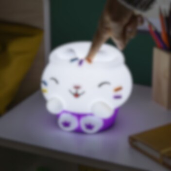 Laat de schattige Cakey Cat een zachte en rustgevende gloed in de kamer verspreiden. De lamp is gemaakt van zacht silicone en toont Cakey Cat in haar klassieke houding. Je schakelt eenvoudig tussen drie lichtstanden door op het hoofd te drukken. Daarnaast heeft de lamp een ingebouwde timer die automatisch uitschakelt na enige tijd. Perfect voor voorleestijd, bedtijd of als een charmant decoratiestuk voor alle fans van Gabby's Dollhouse.
