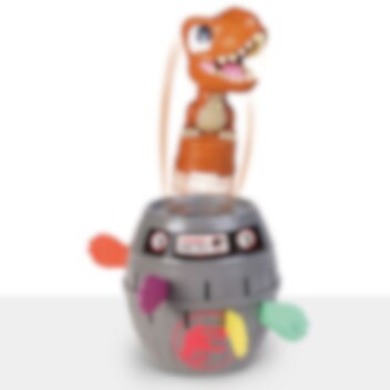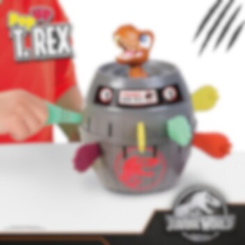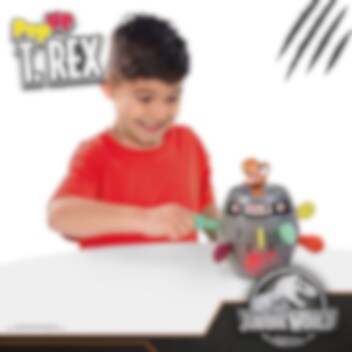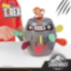 De Pop Up T-Rex-game neemt je mee naar het hart van Jurassic World! Het is alsof je miljoenen jaren terug in de tijd reist... Het gerucht gaat dat een dinosaurus probeert te ontsnappen uit zijn kooi, geobsedeerd door proberen eruit te komen. De enige manier om te weten of hij vastzit of losloopt, is door iets door de zijkanten van de kooi uit het Krijt te schieten. De hartslag zal toenemen, de vingers zullen trillen ... Ben jij degene die de T-rex verstoort? Speel door om de beurt een van je gekleurde dinosaurusbotten door een van de sleuven in de kooi te laten vallen. Als er niets gebeurt, ben je veilig. Je kunt ademhalen. Maar wauw! Als er een dinosaurus opduikt, ben je uit het park en uit het spel!
