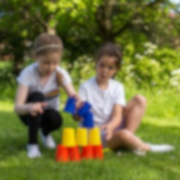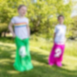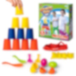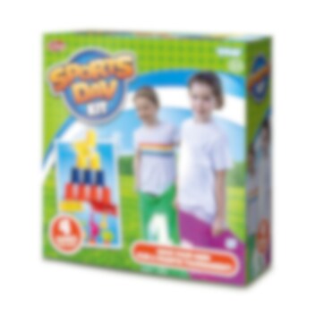 Een buitenspel waar je met je vrienden kan concurreren. Het spel bevat inhoud voor drie verschillende wedstrijden. Gooi erwtenzakjes op bekers, doe zaklopen en balanceer een ei op een lepel.