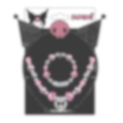 Geef elke outfit extra flair met deze stoere sieradenset van Kuromi. De set bevat een glinsterend diadeem met kattenoortjes, een roze-wit kralenarmbandje met de letters “LOVE” en een bijpassende ketting met een schattige Kuromi-bedel. Het perfecte accessoire voor jonge fans van het Hello Kitty-universum die graag opvallen.