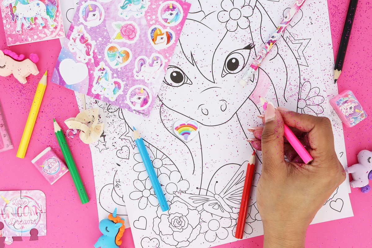 Een complete en leuke kleurset met eenhoornthema die kinderen een hele tijd zal vermaken. Perfect als activiteit tijdens het feestje of als mooi verjaardagscadeau voor de kleine eenhoornfan. Hier vind je alles wat nodig is om direct te beginnen met kleuren, met prachtige eenhoorns, regenbogen en diamanten.