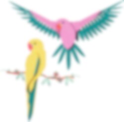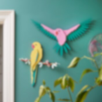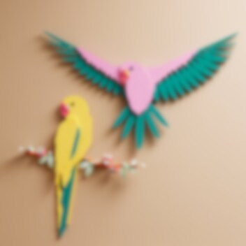 De 644-delige set bevat een gele papegaai van ca. 40 cm hoog en een roze papegaai van ca. 35 cm hoog.