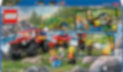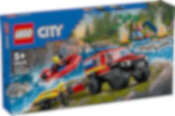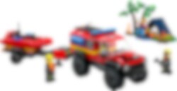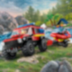 Een kampeerder is gestrand door een bosbrand en een rivier waarvan het water snel stijgt. Tijd om de 4x4 brandweerauto en reddingsboot in te zetten! De enorme banden en stevige ophanging van deze terreinwagen maken hem ideaal voor ruw terrein. Laad de reddingsboot in, koppel de aanhanger vast en rijd naar het rampgebied. Gebruik de krachtige brandblusser van de truck om de vlammen te doven, stap in het bootje en steek de rivier over om de vakantieganger te redden!