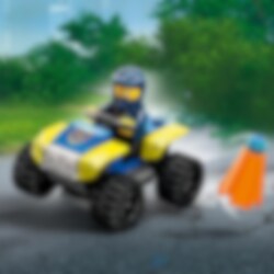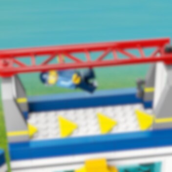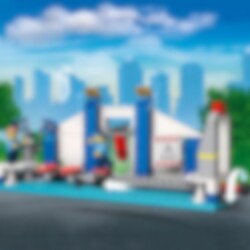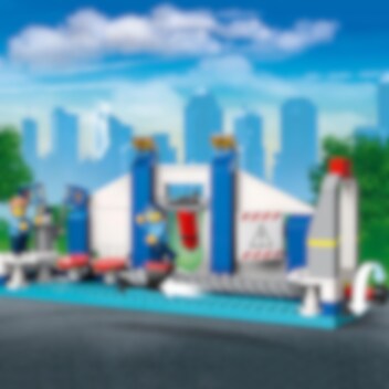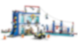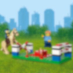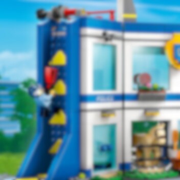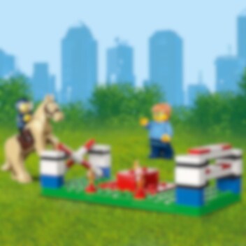 Welkom bij de LEGO® City Politietraining academie! Deze plek zit vol met geweldige uitdagingen voor nieuwe rekruten. Klauter op de klimmuur, slinger aan het klimrek en zoef naar beneden met de tokkelbaan. Bewaar je evenwicht om de geweldige hindernisbaan te voltooien. Race rond de kegels om te slagen voor de rijtest. Zadel dan je paard op en ga voor de hoge sprong. Goed gedaan, nieuweling!