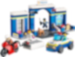 Het is een rustige dag op het LEGO® City politiebureau, wanneer plotseling de politiehond alarm slaat. Woef woef! De gevangenisdeur gaat met een klap open en de boef rent weg! Hij is achterop een motor gesprongen die zojuist de celdeur uit zijn scharnieren heeft getrokken. Schakel snel het onderscheppingsvoertuig in en achtervolg de boeven! Er wachten je avonturen boordevol actie in LEGO City.