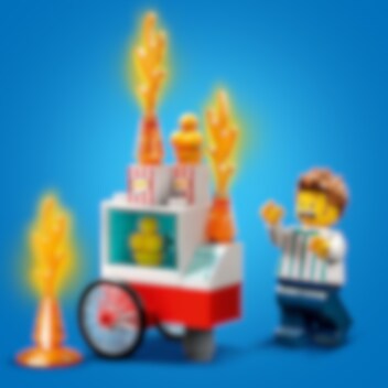 De LEGO® City brandweerlieden doen een welverdiend dutje in de kazerne, als plotseling het alarm afgaat. Oh nee, de kar van de popcornverkoper staat in brand! Kijk op de overzichtsmonitor om de locatie te vinden. Pak je brandweerhelm en neem de glijbaan naar de brandweerwagen... WOEHOE! Race vervolgens naar de plek om de verkoper uit de brand te helpen... en de popcorn natuurlijk!